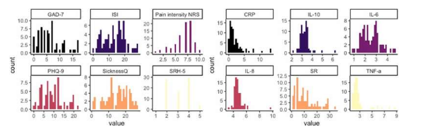 收集卡罗琳斯卡大学医院80例成年慢性疼痛患者自评问卷及血液样本,分析炎症生物标志物水平,分析炎症生物标志物(TNF-α、IL-6、IL-8、IL-10、C反应蛋白(CRP)、红细胞沉降率(ESR))与抑郁、失眠、焦虑、自评健康、病态行为及疼痛强度的关系。